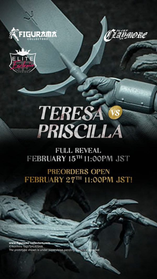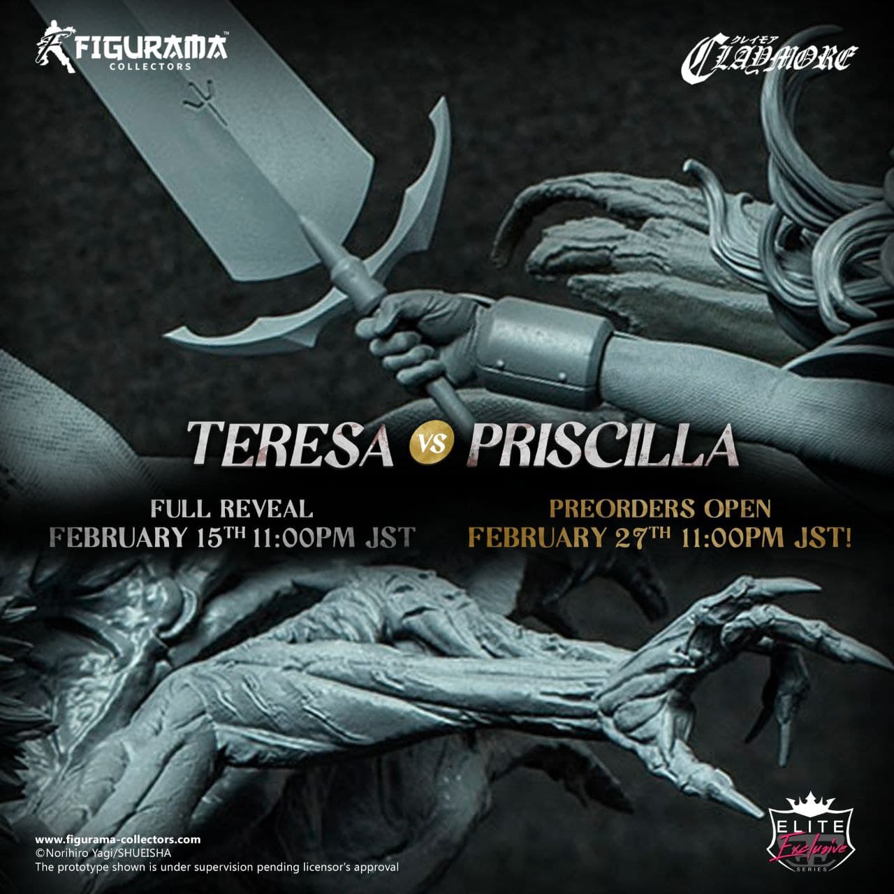 Figurama ปล่อยทีเซอร์ภาพงานปั้นใหม่ ที่ยังคงเป็นงานปั้นแนวปะทะกันเช่นเคย โดยงวดนี้ เป็นการปะทะกันของ Teresa  และ  Priscilla จากการ์ตูนแฟนตาซี Claymore ซึ่งทางค่ายเตรียมเผยรายละเอียดอีกครั้ง พร้อมเปิดรับจองในช่วงวันที่ 27 กพ. นี้