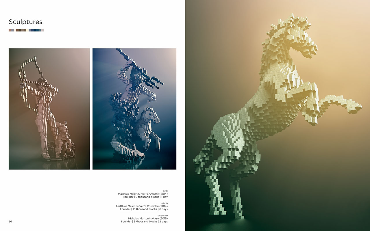 ด้วยการใช้บล็อคเป็นรูปสี่เหลี่ยมจตุรัส สีต่างๆ มาต่อกันไปเรื่อยๆ จนได้ออกมาเป็นผลงานสุดเจ๋ง ไม่ว่าจะเป็นสถานที่ในจินตนาการ หรือสถานที่สำคัญๆ ของโลก หรือจะเป็นมังกรก็ทำได้ ซึ่งเป็นการส่งเสริมในเรื่องของจินตนาการได้เป็นอย่างดี ผลงานแต่ละอย่างจะถูกรวมไว้ในหนังสือ Beautiful Minecraft ที่มีทั้งหมดกว่า 112 ชิ้นงาน ซึ่งทางคุณ James Delaney ผู้จัดทำหนังสือเล่มนี้ได้ให้เหตุผลที่ทำมันขึ้นมาเพื่อแสดงให้เห็นว่าผู้เล่นทุกคนสามารถกลายเป็นศิลปินได้
