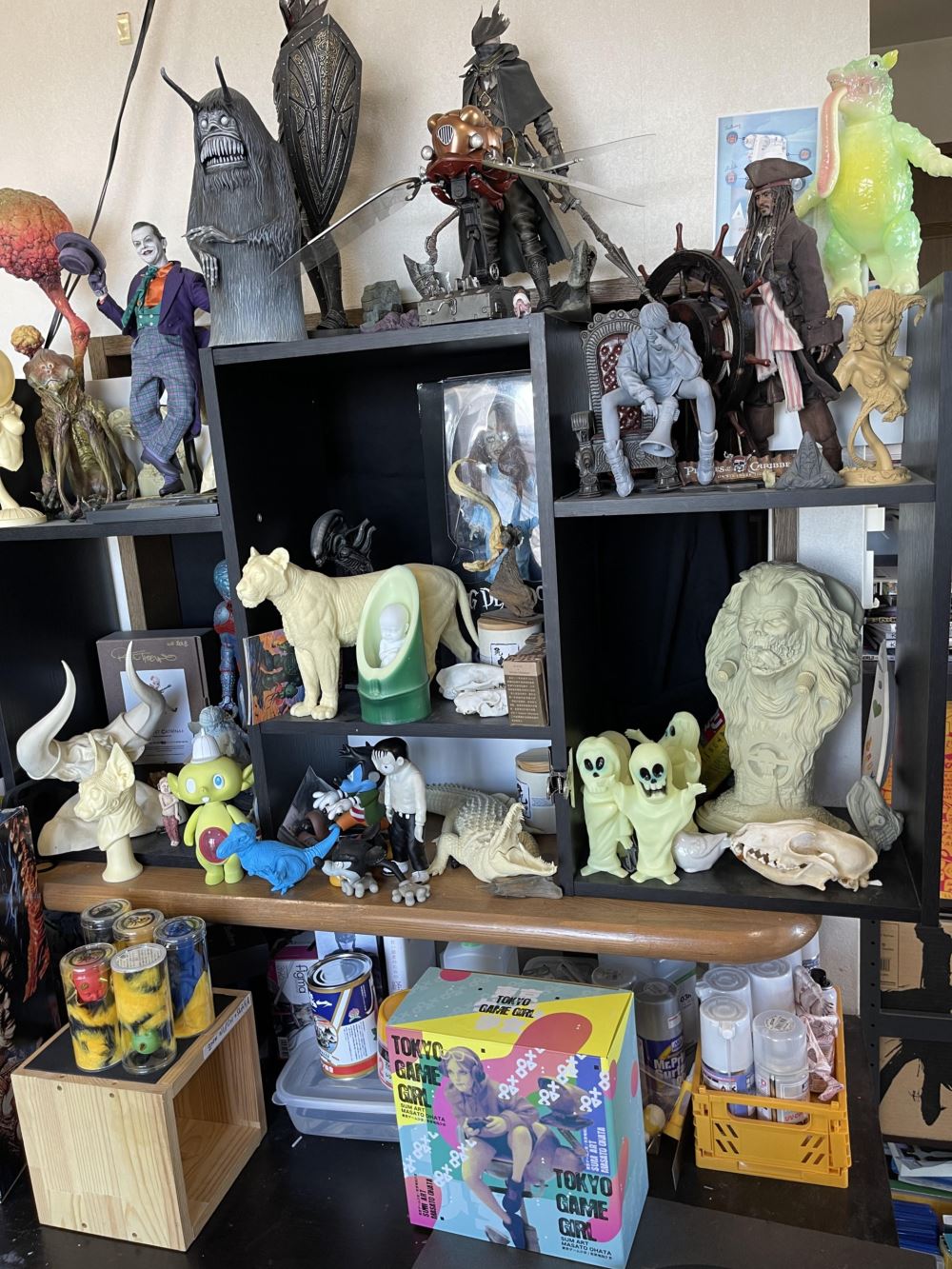 บรรยากาศในชั้นวางของ และโต๊ะทำงานของเขา