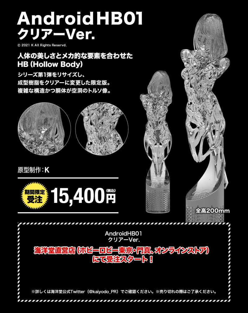 หลังจากสินค้า Android HB01 ซีรีส์ฟิกเกอร์แบบ GK รุ่น "DIGITAL GARAGE KIT" ซึ่งผลิตและจำหน่ายโดย Kaiyido ที่วางจำหน่ายไปเมื่อปีที่แล้ว และกำลังจะมี Android HB02 ตามมาเป็นตัวที่สอง ทาง Kaiyodo ได้นำสินค้า 2 รายการได้แก่ Android HB01 Transparent Ver (แบบรุ่นใส) กับหุ่น Android HB01 แบบเต็มตัวขนาด 1/12 มาวางจำหน่ายทางออนไลน์แบบลิมิตเต็ดผ่านช่องทาง Kaiyodo online store เท่านั้น!!