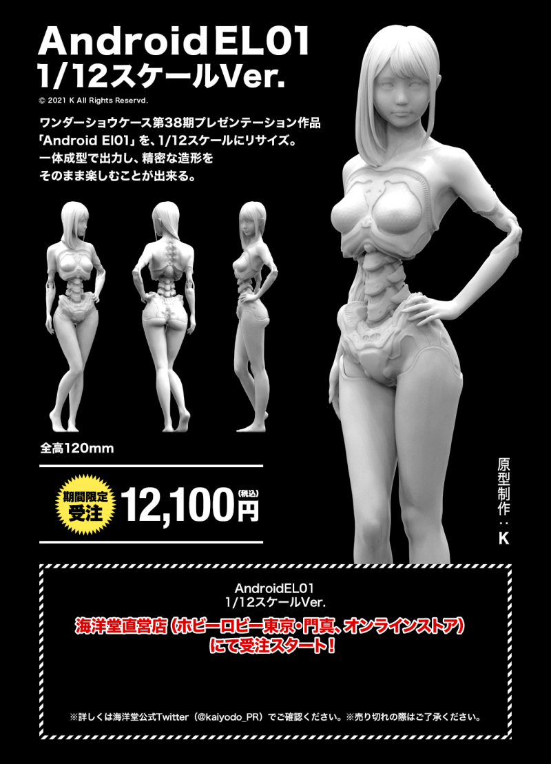 นอกจากนี้สินค้าลิมิติเต็ดอีกตัวนึงที่ผลิตออกมาขายเป็นพิเศษก็คือหุ่น AndroidEL01 ที่ทำออกมาในขนาด 1/12 แต่มีจุดที่แตกต่างก็คือสินค้าชิ้นนี้จะมาแบบเต็มตัว ไม่ใช่งานบัสเหมือนที่ผ่าน ๆ มา นอกจากนี้ยังมีการปรับเปลี่ยนดีไซน์ของบอดี้ให้ดูแตกต่างไปจากเดิมอีกด้วย ส่วนจะโดนใจนักสะสมรึเปล่า คงต้องประเมินด้วยความรู้สึกกันอีกที เนื่องจากตัวสินค้าจะสวยหรือไม่ คงต้องขึ้นอยู่กับฝีมือการลงสีของนักสะสมเองแล้วล่ะ!!