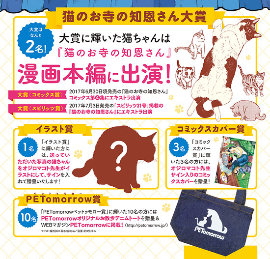 โดยรางวัลจะมี 2 ครั้ง ครั้งแรกแมวที่ชนะจะได้โผล่ในการ์ตูนเล่ม 4 ที่จะวางจำหน่ายวันที่ 30 มิถุนายนนี้ ส่วนอีกรางวัลนึง จะได้ลงในการ์ตูนในนิตยสาร Big Comics ฉบับวันที่ 3 กรกฎาคม นอกจากนี้ยังมีรางวัลอื่น ๆ อีก เช่น ภาพวาด ปกการ์ตูน และ รางวัล PETomorrow โดยภาพของบรรดาน้องแมวทั้งหลายที่แฟน ๆ ส่งเข้ามาจะถูกตีพิมพ์อยู่ในนิตยสาร Big Comics ฉบับวันที่ 3 กรกฎาคมด้วยเช่นกัน