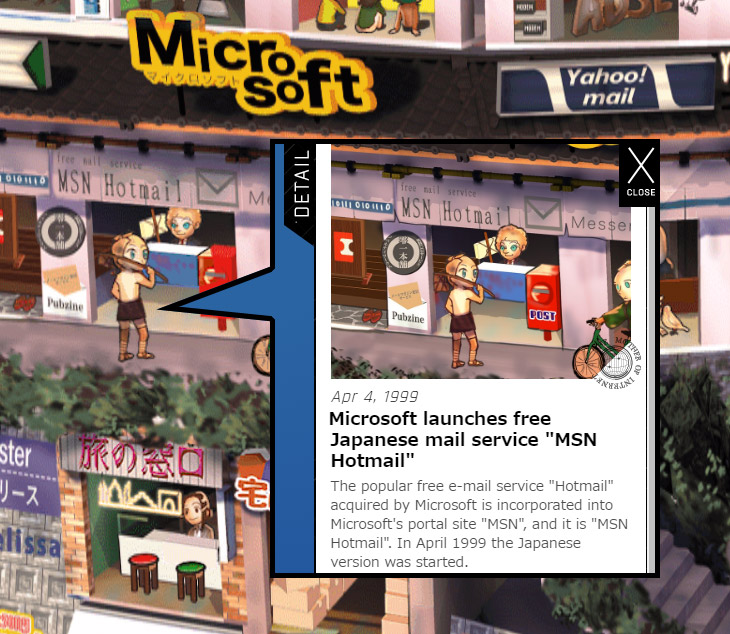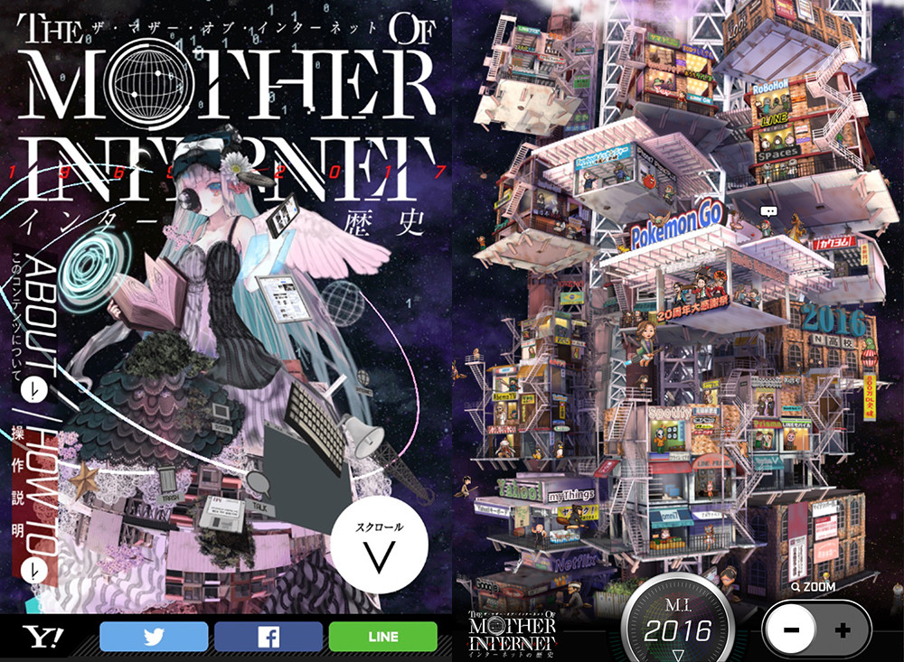 ภาพในเว็บจะเริ่มต้นที่ปี 2016 ซึ่งเมื่อคุณเลื่อนลงไปด้านล่าง ก็จะเห็นภาพของกิจกรรมเด่น ๆ ต่าง ๆ ที่เกิดขึ้นในโลกของอินเทอเน็ตที่ญี่ปุ่น เช่น เว็บไซต์ดัง ๆ อย่าง Facebook Twitter หรือแม้แต่เกมดัง ๆ อย่างโปเกมอน เป็นต้น ซึ่งถ้าเราไปคลิกที่ตำแหน่งต่าง ๆ ที่เห็น ก็จะมีคำอธิบายเกี่ยวกับเหตุการณ์นั้น ๆ ขึ้นมาให้เราเข้าใจด้วย (ตามตัวอย่างภาพข้างล่างนี้)