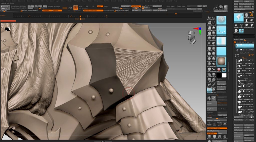 ลายเส้นบนชุดเกราะ ใช้การวาดรายเส้นเข้าไปทีละเส้นด้วย brush ของโปรแกรม Z-Brush