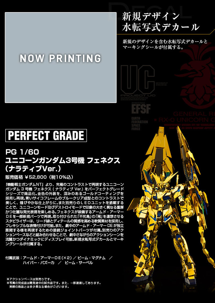 นาน ๆ จะผลิตออกมาซักตัว กับหุ่นกันดั้มรุ่น Perfect Grade ตัวล่าสุดที่นำ Gundam Unicorn กลับมาอีกครั้งในแบบชุดสีทองทั้งตัว เตรียมวางจำหน่ายในชื่อ "PG 1/60 Unicorn Gundam Unit 3 Phoenix (Narrative Ver.)" ซึ่งตัวฟิกเกอร์จะยังคงใช้โครงสร้างแบบเดียวกันกับ PG Unicorn เดิม แต่มีการเพิ่มชิ้นส่วนใหม่ที่เพิ่มความบาลานซ์ให้กับปีกของหุ่นมากขึ้น นอกจากนี้ยังมีเกราะแขน และวัสดุเชื่อมต่อแบบใหม่ที่ทำให้การปรับเปลี่ยนเชฟของหุ่นมีอิสระมากยิ่งขึ้น