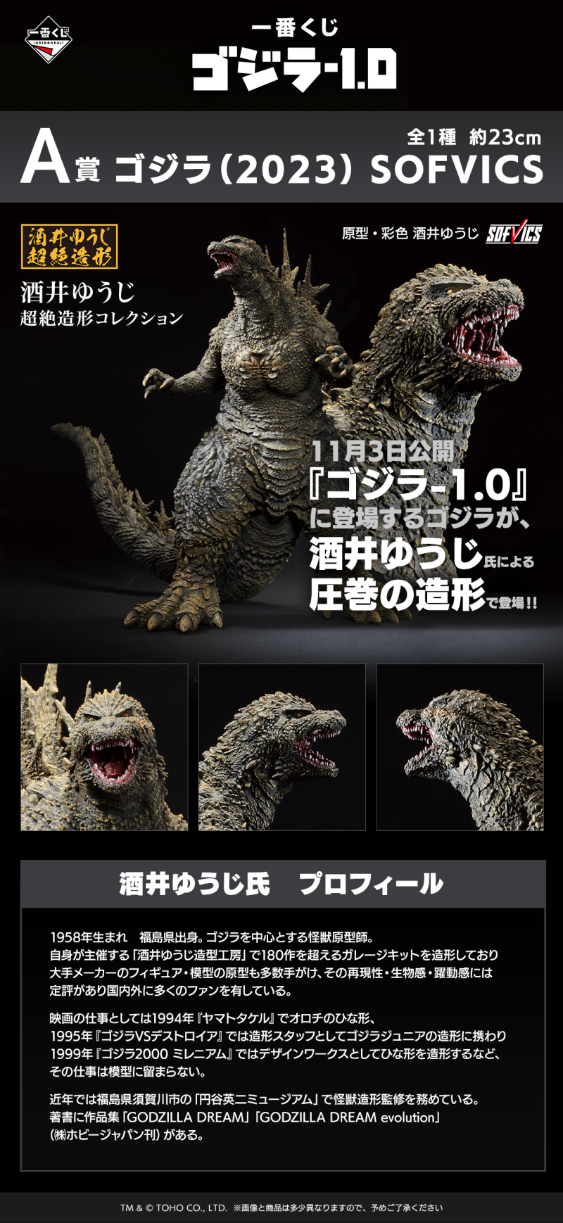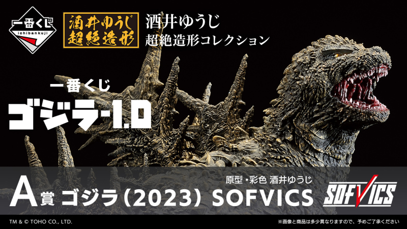 มีออกมาอีกแล้ว กับงานฟิกเกอร์ซอฟ์วิกสวย ๆ ของก๊อตซิลล่า ที่ผลิตออกมาในรูปแบบสินค้าจับรางวัลในชื่อว่า "Ichiban Kuji Godzilla-1.0" โดยมีรางวับใหญ่เป็นฟิกเกอร์ "Godzilla (2023) SOFVICS" ที่ปั้นโดยยูจิ ซาไค
