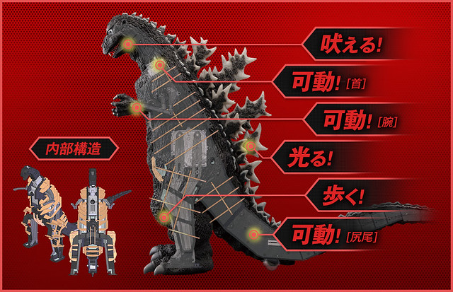 หนึ่งในไฮไลท์ที่น่าสนใจ ก็คือฟิกเกอร์ก๊อตซิลล่า ซึ่งทำขึ้นจากร่างต้นแบบยุคแรก ๆ ของก๊อตซิลล่า แต่มันจะไม่ใช่แค่ตุ๊กตาที่ยืนทื่อ ๆ เฉย ๆ เพราะหุ่นตัวนี้จะมีกลไกอยู่ข้างใน ทำให้สามารถควบคุมจุดขยับต่าง ๆ ได้ด้วยรีโมทคอนโทรล เจ๋งป่ะล่ะ!!