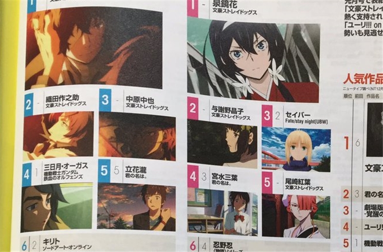 เมื่อเดือนที่แล้ว ฟรานไชส์การ์ตูนกันดั้มได้ตำแหน่งในนิตยสาร Newtype ไปครองเกือบหมด แต่ในเดือนนี้ อนิเมะแนวสืบสวน "Bungou Stray Dogs" ได้ขึ้นมาครองตำแหน่งแทนแล้ว
