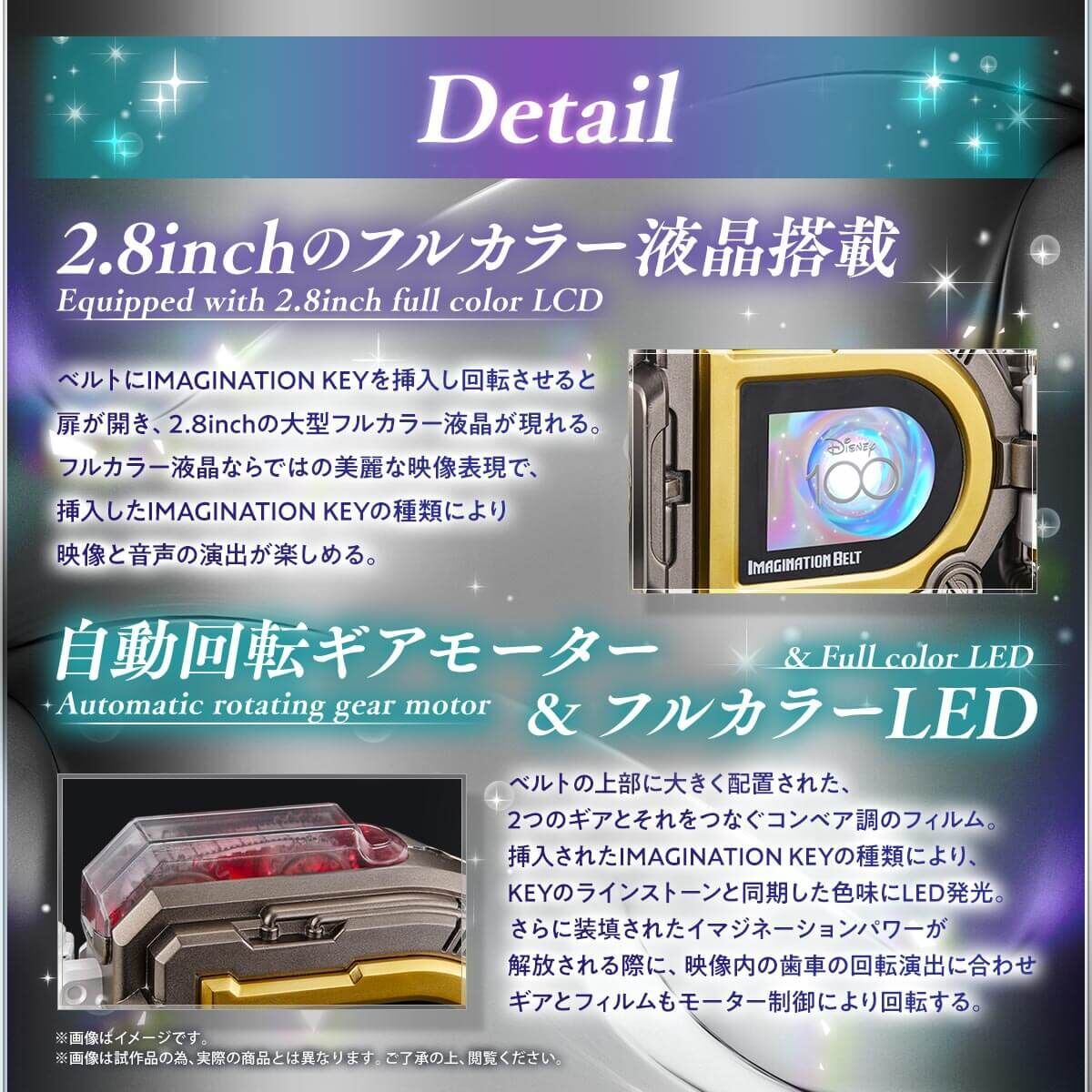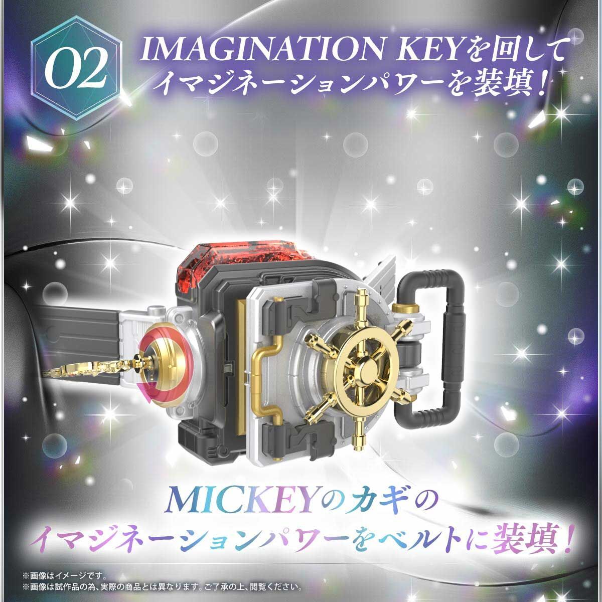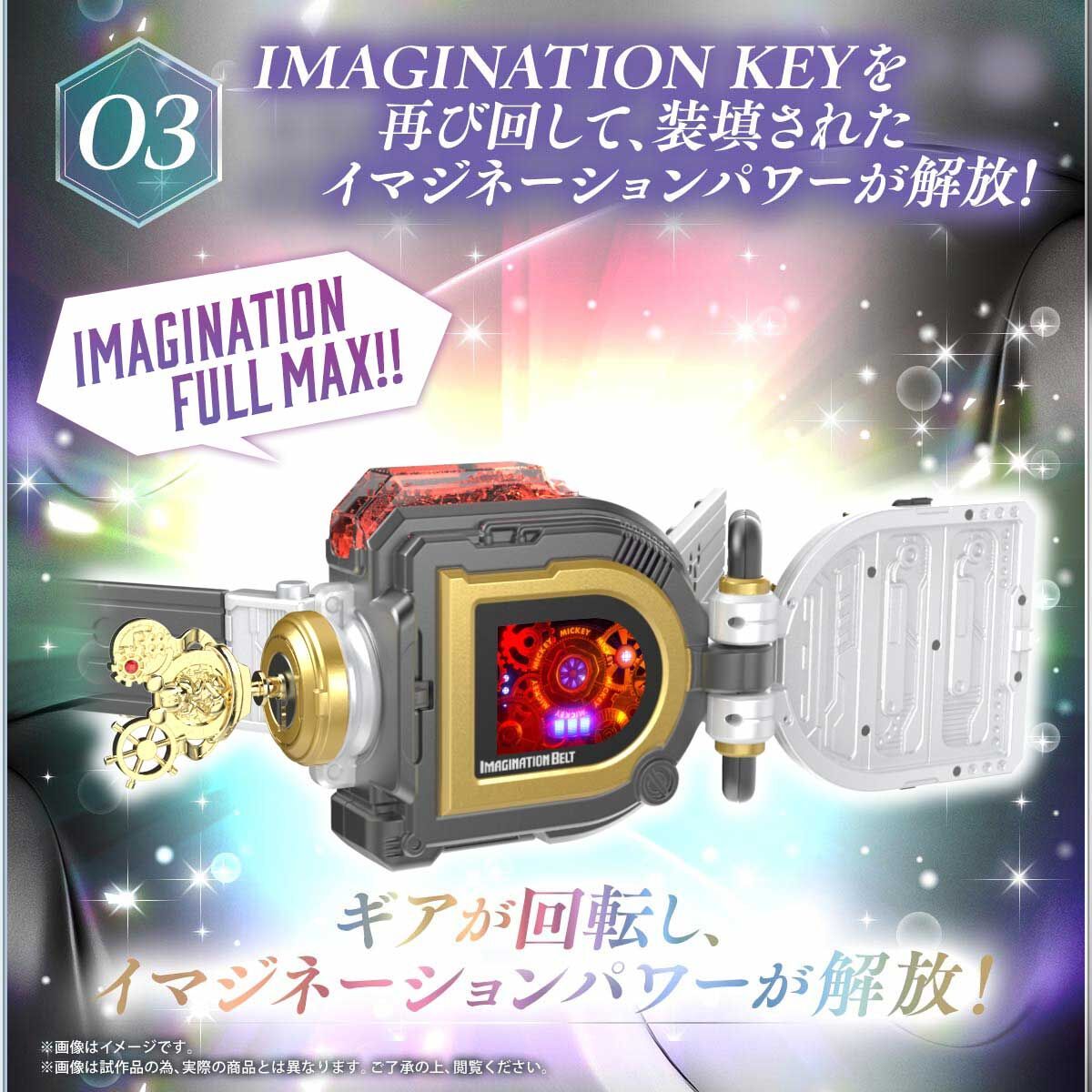 "Disney IMAGINATION BELT" ใช้ประสบการณ์และเทคโนโลยีอันยาวนานของ Bandai ในการผลิตเข็มขัดแปลงร่างของ "Kamen Rider" โดยมีธีมของการสร้างโลกใหม่ที่ผสมผสานตัวละครจาก Disney และฮีโร่โทคุซัตสึของชาวญี่ปุ่น