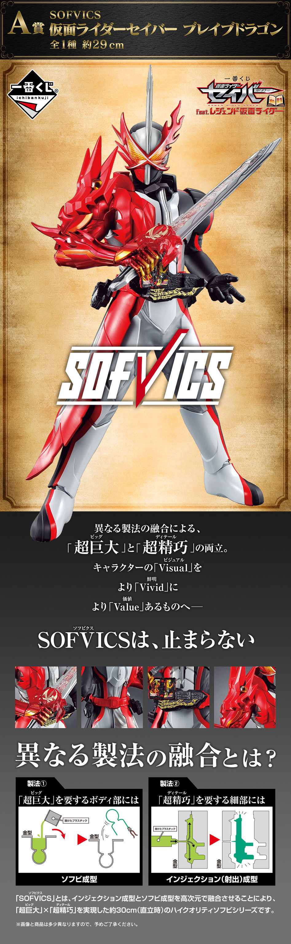 หนังกำลังฉาย ของขายก็ต้องมา!! และแล้ว งานซอฟท์ตัวล่าสุดของ Kamen Rider Saber Brave Dragon ก็ถูกนำมาทำเป็นของรางวัลเสี่ยงโชค "Ichibankuji Kamen Rider Saber NO.01 feat. Legend Kamen Rider" ตามไรเดอร์รุ่นพี่ทั้งหลาย โดยงานซอฟท์ชิ้นนี้จะมีความสูง 29 ซม. และแน่นอน มันคือรางวัลแบบ A ที่มีรายละเอียดสวยงาม แต่การจะได้มาครอบครองนั้นก็เรียกว่ายากเช่นกัน!!