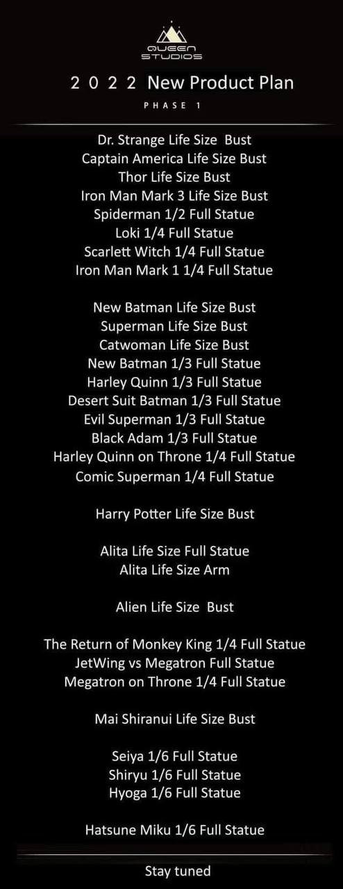 Queen Studios ปล่อยข้อมูลลิขสิทธ์ที่ทางสตูดิโอได้รับและเตรียมผลิตเป็นสินค้าออกมาในอนาคต ซึ่งพอดูไปเรื่อย ๆ ก็พบว่า นอกจากฮีโร่หรือตัวละครดังจากภาพยนต์เรื่องต่าง ๆ แล้ว ก็มีลิขสิทธ์จากการ์ตูนและเกมดังจากฝั่งญี่ปุ่นอยู่ด้วย แสดงว่าในอนาคต เราคงได้เห็นงานปั้นสไตล์อนิเมะจากค่าย Queen Studios กันอย่างแน่นอน!! ใครที่เป็นแฟนงานปั้นค่ายนี้ ก็รอแบบคาดหวังกันได้เลย!!