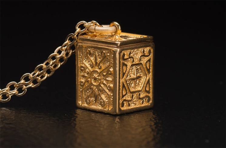 ตัวสร้อยนี้จะทำจากเงิน 925 และชุบทอง K18 ส่วนตัวกล่องใส่ชุดที่ทำเป็นจี้ จะมีขนาดความยาว 14.5 mm และกว้าง x 11.5 mm โดยรูปแบบที่ทำมา จะดีไซน์ให้ออกแนวแฟชั่นเก๋ ๆ ชนิดที่สาว ๆ เองก็สามารถสวมใส่เป็นเครื่องประดับได้อย่างไม่เคอะเขิน
