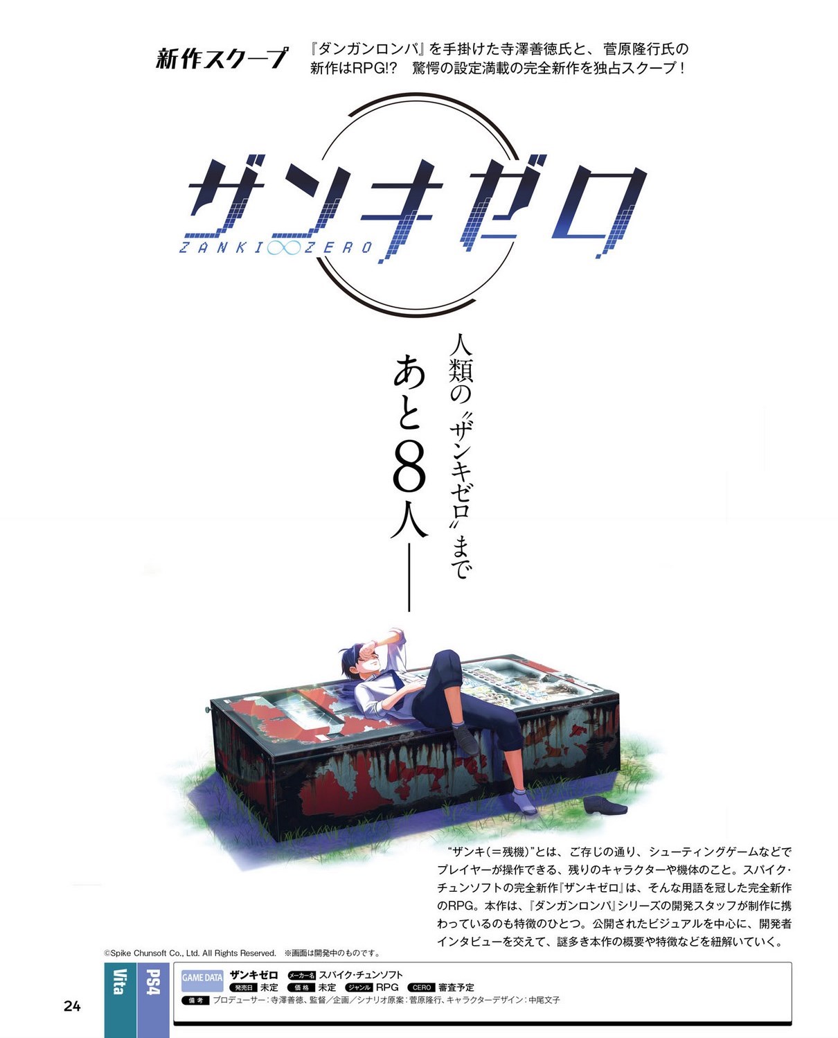 Spike Chunsoft ประกาศเปิดตัว "Zanki Zero" เกมอาร์พีจีแนวเอาชีวิตรอดตัวใหม่ ที่พัฒนาลงเครื่อง PlayStation 4 และ PS-Vita พัฒนาโดยทีมงานผู้สร้างซีรีส์เกม Danganronpa ที่เรารู้จักกันดี